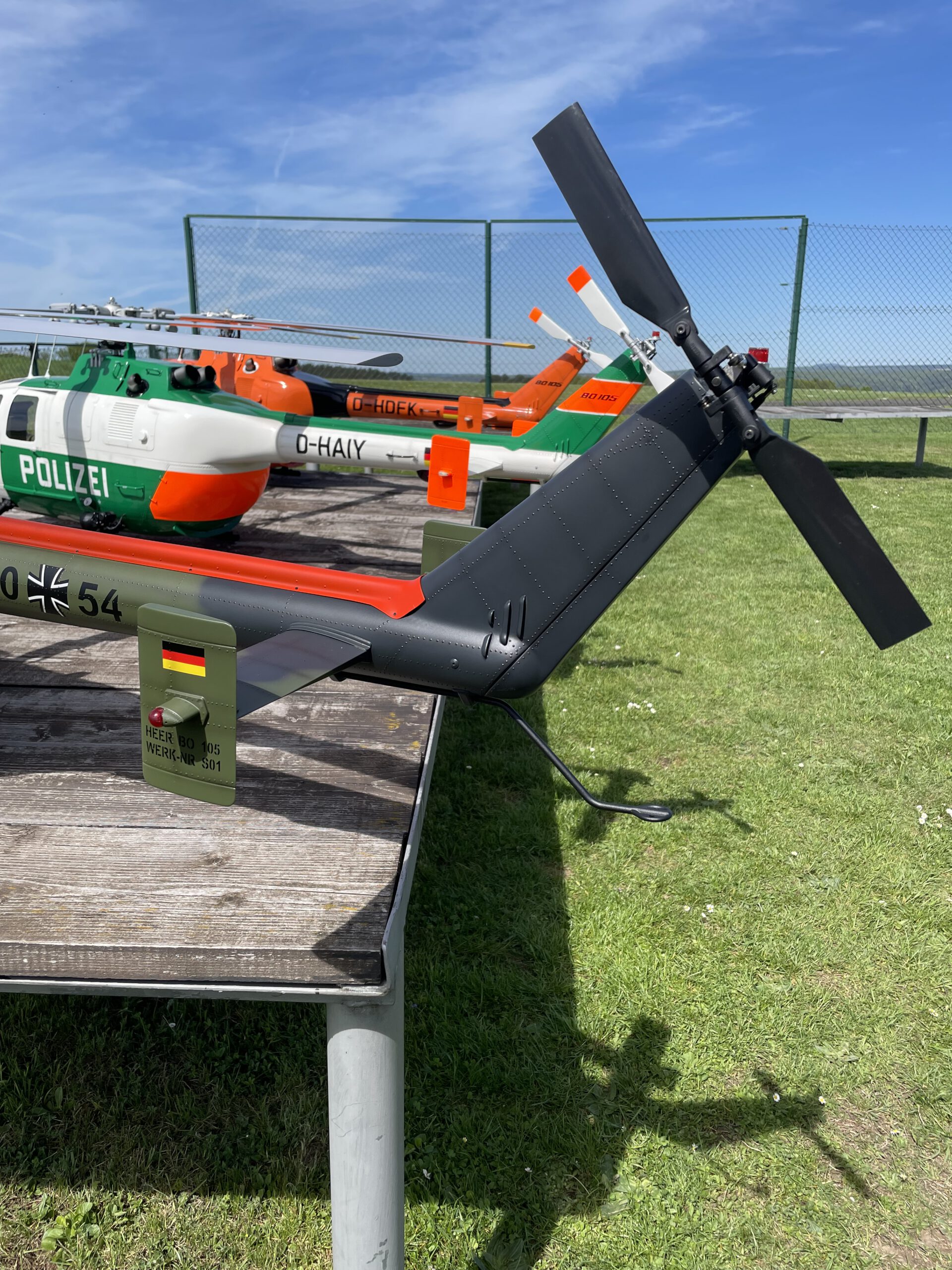 Eigentlich sollten die Rotorblätter „nur“ beklebt werden um das Budget etwas zu schonen. Durch die Form am Blathals wäre das bekleben aber nur „semioptimal“ gewesen, weshalb der Lackierer von Heiko Fischer noch mal einen kleinen Zusatzauftrag erhalten hat. Bei der Gelegenheit wurden dann auch noch die Rotorköpfe mitlackiert, was das Ergebnis des gesamten Modells noch mal erheblich verschönert hat.